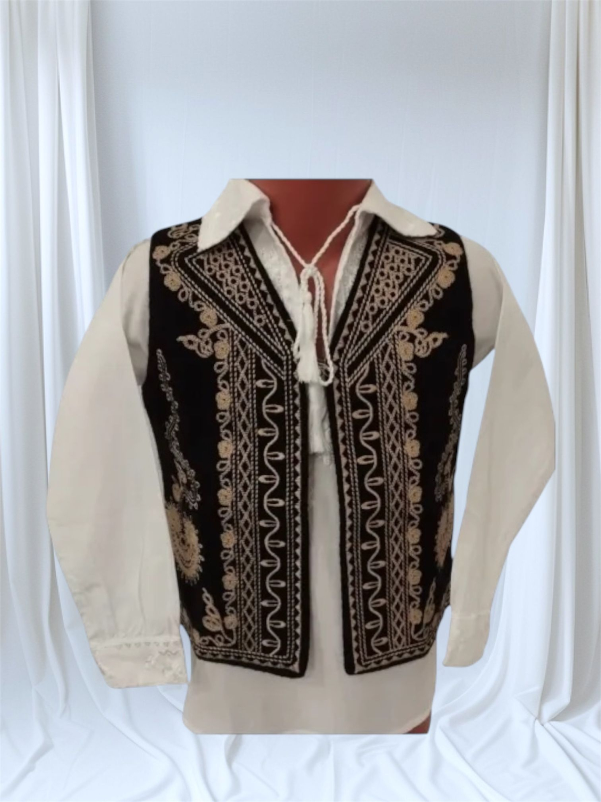 Îmbină tradiția cu stilul modern cu această vestă națională pentru băieți, perfectă pentru evenimente speciale sau pentru a adăuga un strop de autenticitate în garderoba celor mici. Realizată din materiale de calitate, cu un design inspirat din tradițiile populare, această vestă aduce un plus de eleganță și rafinament oricărei ținute.