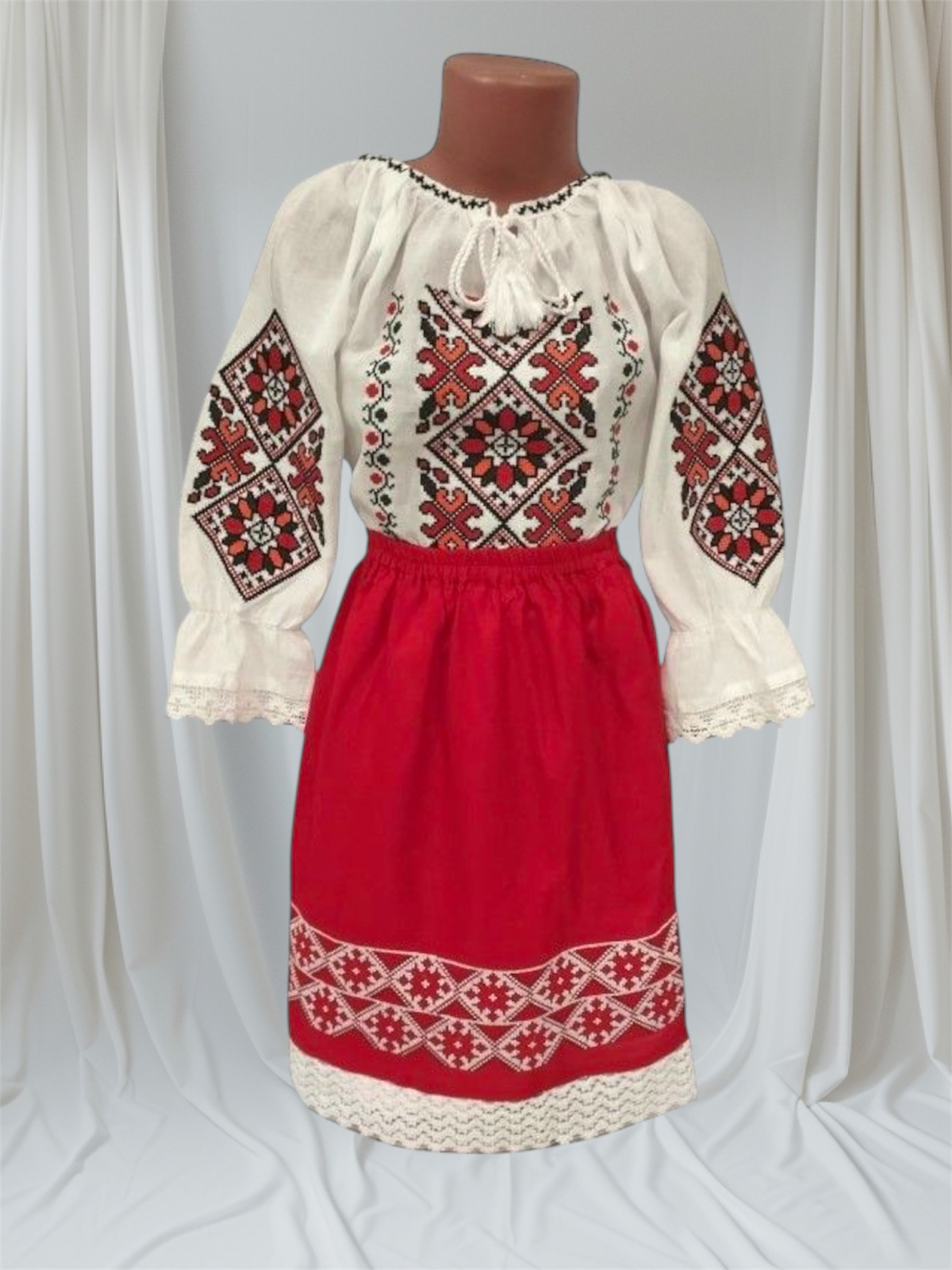 Ansamblul oferă o ținută completă gata de purtat, compusă dintr-o ie bogat ornamentată și o fustă asortată.